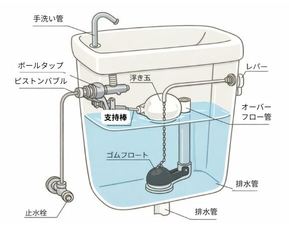 この様にタンクの中を確認することによって、給水弁(ボールタップ)の不良による水漏れか、排水弁(フロートバルブ)の不良による水漏れかの判断が出来るのです。