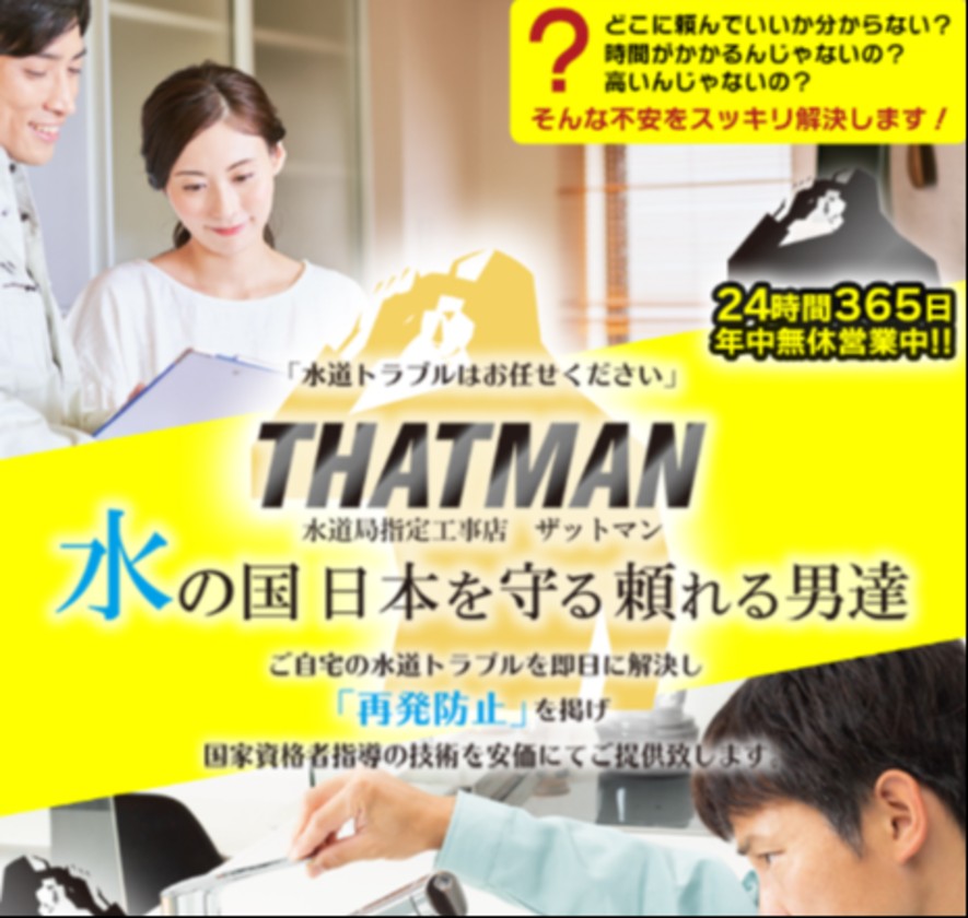 ザットマンは、水漏れ・トイレのつまり・排水不良など、水まわりのトラブルに迅速・丁寧・良心価格で対応してくれる信頼の水道修理業者です。